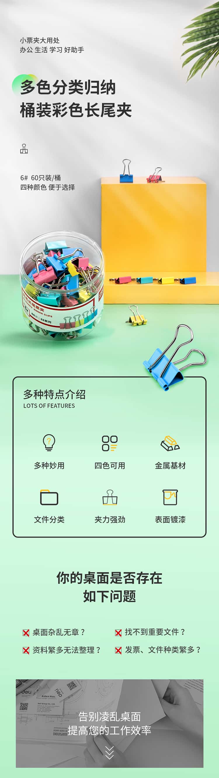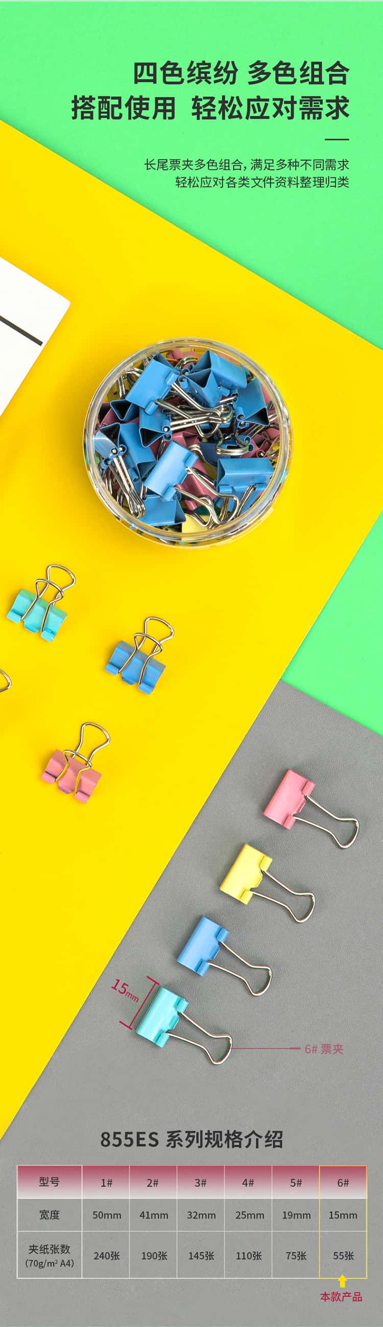 得力(deli)60只15mm彩色长尾夹票夹6#小号金属燕尾夹票据文件夹子办公用品8556ES